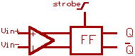 Eine Literaturrecherche ergab, dass das erfolgversprechendste Konzept eine "strobed-Flip-Flop"-Schaltung ist. Bei einer solchen Schaltung werden, wie linksseitig im Blockschaltbild angedeutet, die Eingänge eines Flip-Flop von einem Differenzverstärker angesteuert. Das Flip-Flop wird getaktet betrieben und fällt, abhängig von seinen Eingängen, in die eine oder andere Richtung.