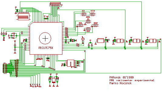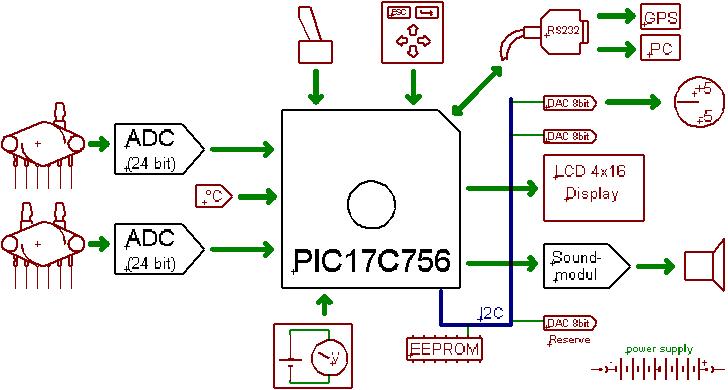 Herzstück des Variometers ist ein PIC17C756. Dieser Einchipmikrokontroller hat 16 KByte EPROM Programmspeicher, der mehr als ausreichend ist, um die gewünschte Funktionalität zu implementieren.