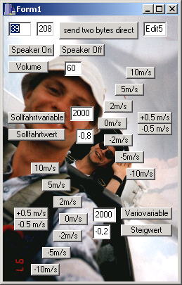 Natürlich ist auch eine akustische Ausgabe vorgesehen. Hierfür würde ein eigenes Soundmodul unter Verwendung eines PIC16F876 entwickelt. Dem Soundmodul wird per RS232 die Information über den aktuellen Steigwert, sowie ob der Sollfahrt- oder Variomode geschaltet ist übermittelt. Weiterhin kennt dieses Soundmodul Befehle zur Einstellung der Lautstärke sowie einigen Initialisierungsparametern. Dieses Soundmodul enthält einen digitalen Sinusgenerator-IC vom Typ ML2036. Um die Entwicklung des Soundmoduls schneller zu bewältigen, wurde ein Windows-Testprogramm geschrieben, welches sämtliche Befehle auslösen kann. Der Screenschot ist auf dem Bild zu sehen. Alles weitere kann der Firmware für das Soundmodul entnommen werden. Die Hardware ist als Eagle-File downloadbar.