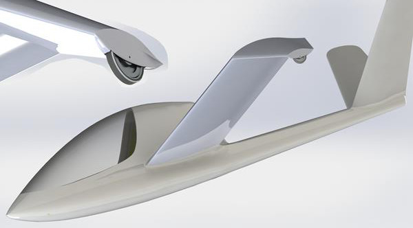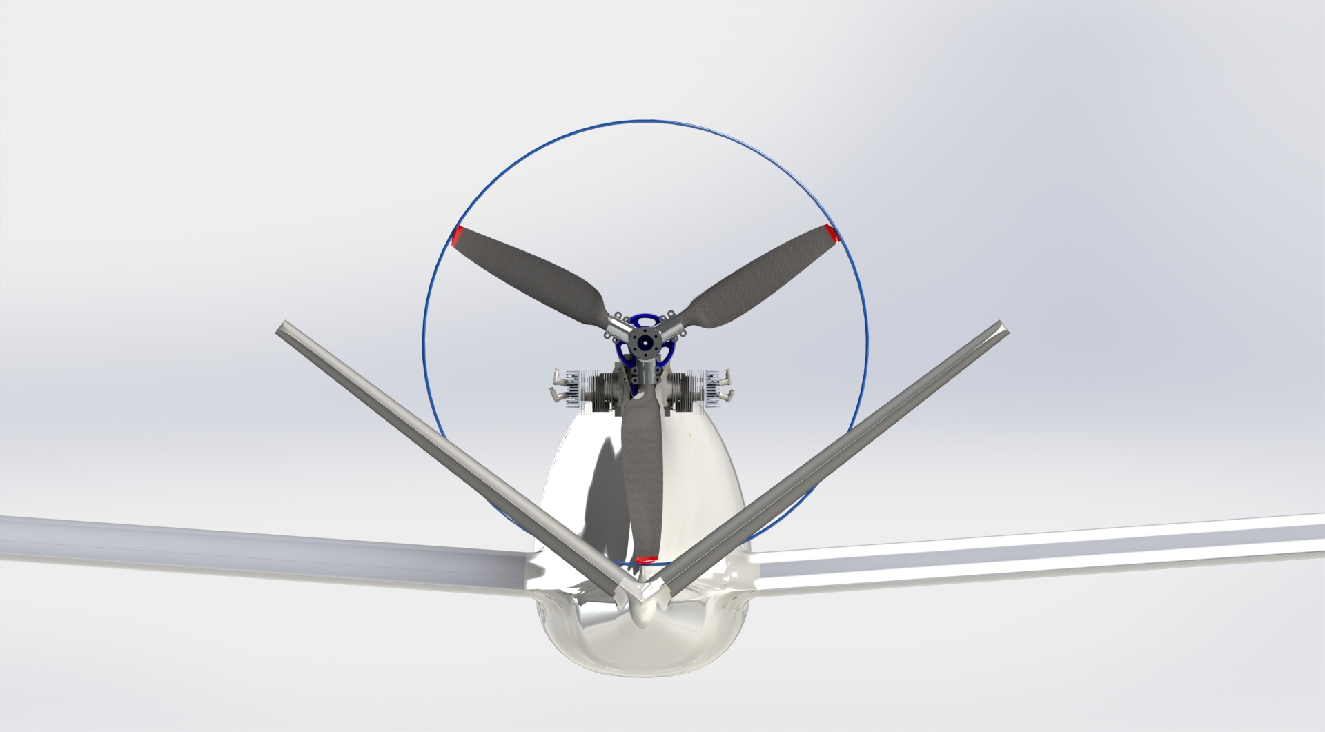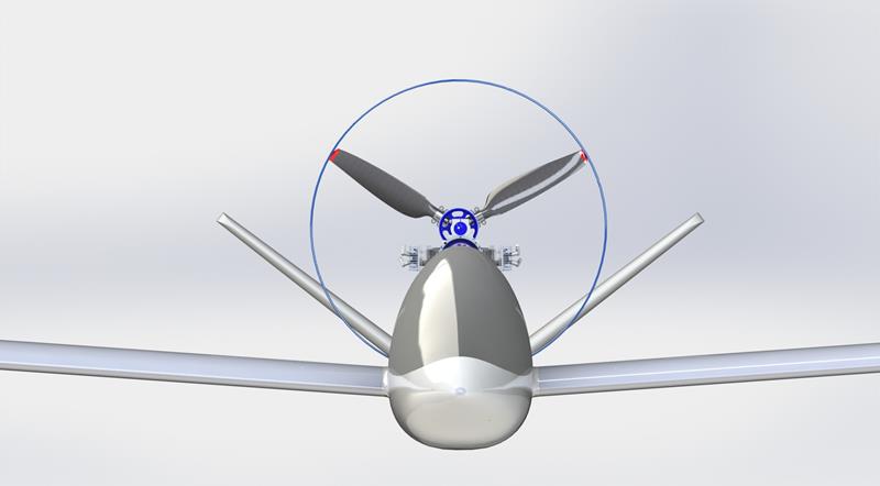 Another thing to consider for choosing the engine height is the intersection of the propeller circle and the V-tail. In my current design there is a slight intersection.