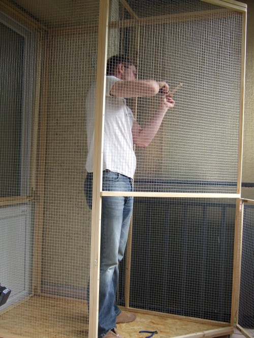 Am Abend stand das Gerüst, alle Scharniere und Winkel waren an der richtigen Stelle - die Sache nahm richtig Form an. Für heute war es aber genug! Aufräumen, kehren und Möbel wieder raus. Marko hat mich dann mit meinem Käfig schon mal in der Balkonvoliere Probe schlafen lassen - aber es dauert noch ein paar Tage bis ich hier einziehen kann.